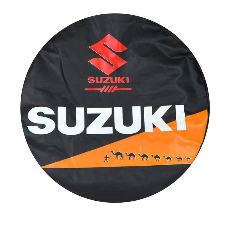 Чохол для запасного колеса Suzuki Snakeman 4WD призначений для позашляхових автомобілів. Міцний та елегантний виріб виконаний у чорному кольорі з декоративним принтом у білому, помаранчевому та червоному кольорах і фірмовим логотипом Suzuki. Чохол виготовлений з якісної екошкіри та оснащений стягувальним шнурком ззаду для надійної фіксації.
